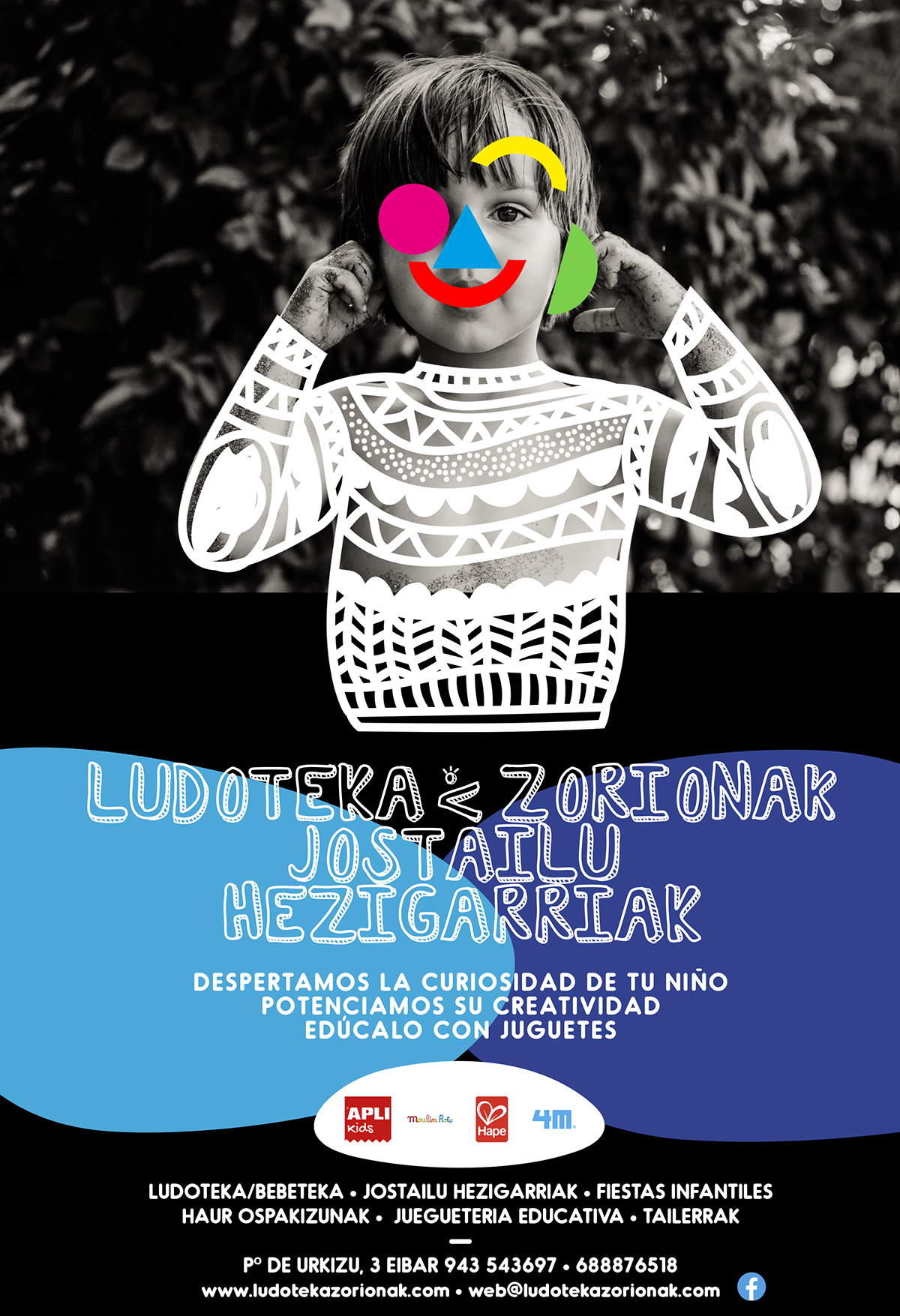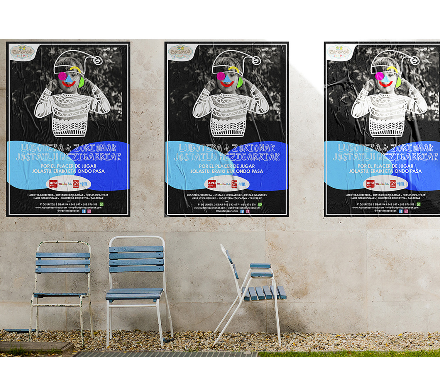 Utilizamos código gráfico y visual de comunicación para promocionar la actividad lúdica en el espacio para niños Ludoteca Zorionak.